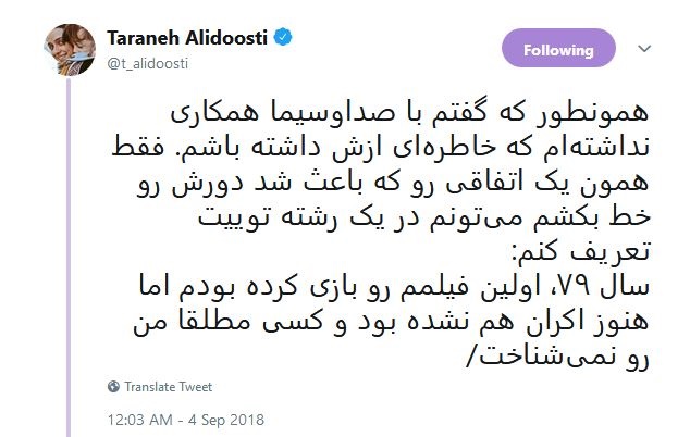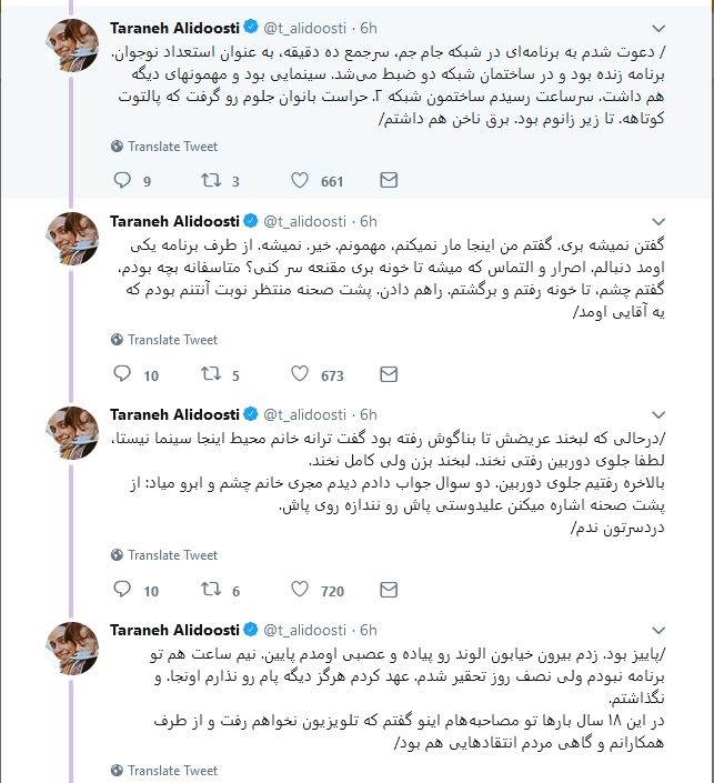 ترانه علیدوستی در یک رشته توئیت درباره رویدادی که سال ۷۹ در تلویزیون برایش اتفاق افتاده بود، افشاگری کرد و توضیح داد که چرا از آن پس از صداوسیما گریزان شده است.
