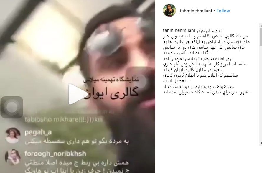 تهمینه میلانی با بیان اینکه تعدادی از هنرمندان جوان حوزه تجسمی در واکنش به برپایی نمایشگاه آثارش آشوب کردند، اعلام کرد آن گالری که نمایشگاهش در آن برپاست تا اطلاع ثانوی تعطیل خواهد بود.