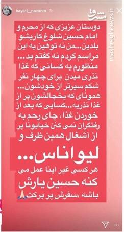 نازنین بیاتی، بازیگر سینما در اینستاگرام خود نوشت: «محرم، به جای پرداخت میلیاردها تومان به مداحان برای گریاندن شما آنرا هزینه خنداندن یتیمی کنید»