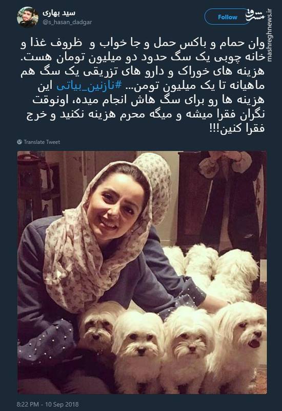 یک کاربر فضای مجازی در توییتر با انتشار تصویری از نازنین بیاتی در کنار سگ هایش به هزینه های نگه داری یک سگ در منزل پرداخت و به اظهارات اخیر این سلبریتی درباره هزینه کردن در ماه محرم واکنش نشان داد.