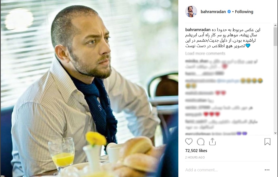 بهرام رادان با انتشار این عکس در صفحه اش نوشت: این عکس مربوط به حدودا ده سال پیشه، موهام رو سر کار راه آبی ابریشم تراشیده بودن، از دلیل جدیت/خشمم در این تصویر هیچ اطلاعی در دست نیست.