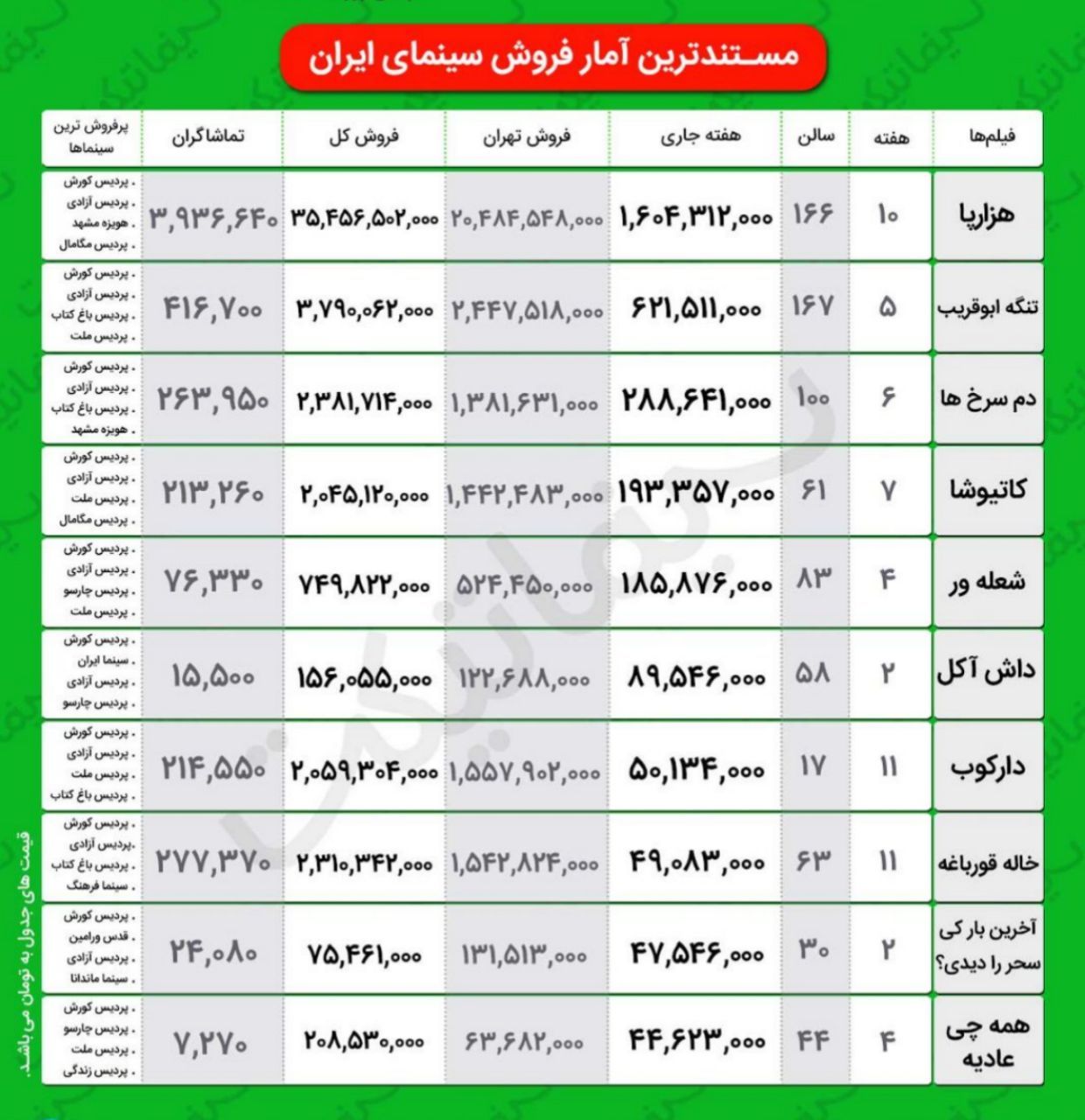 خبرفوری فرهنگی سینما و تئاتر ۲۱ شهریور ۱۳۹۷ ۲۰:۵۶ جدول فروش فیلم های روی پرده تا ۲۰ شهریور «هزارپا» با ۱۰ هفته صدرنشینی و فروش هفتگی میلیاردی همچنان در صدر کپی شد کدخبر: 584278 ت ت 728 سینمای ایران کپی شد با دوستان خود به اشتراک بگذارید: