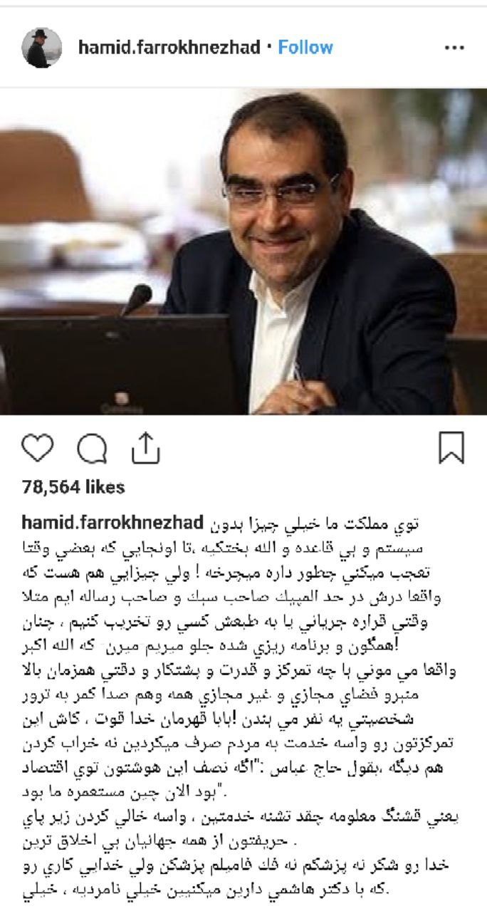 حمید فرخ نژاد با انتشار عکسی به حمایت از وزیر بهداشت پرداخت.