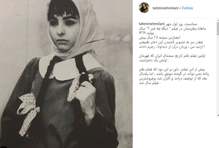 تهمینه میلانی به مناسبت فرا رسیدن روز اول مهر و بازگشایی مدارس، تصویری از فیلم قدیمی خود با عنوان «دیگه چه خبر» را در اینستاگرام منتشر کرد و نوشت: «بهمناسبت روز اول مهر، ماهایا پطرسیان در فیلم «دیگه چه خبر؟» سال تولید ١٣٦٩