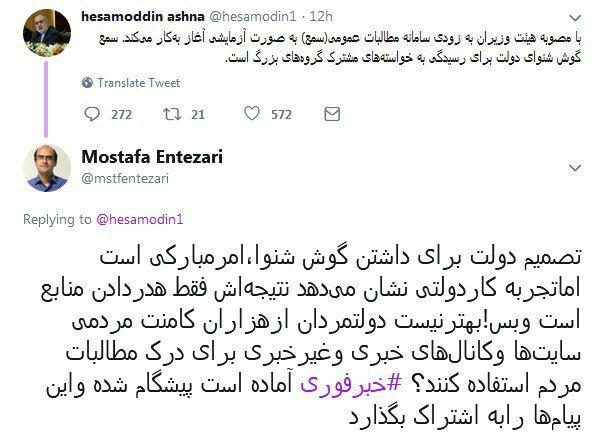 یکی از چهره های دولتی خبر داده است که دولت می خواهد سامانه مطالبات عمومی (سمع) برای آشنایی با مطالبات مردم ایجاد کند. اما واقعا دولتمردان نمی توانند با رصد کامنت ها و پیامهای مردمی متوجه مطالبات مردم شوند؟حسام الدین آشنا را شاید بتوان سخنگوی غیررسمی دولت نامید. چهره ای که این روزها در نبود سخنگوی رسمی، بار اصلی اطلاع رسانی درباره برنامه های دولت را بردوش می کشد.