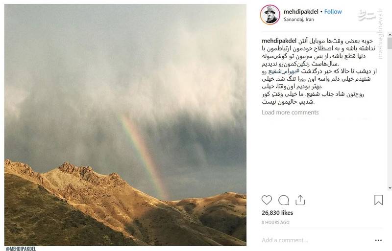 مهدی پاکدل بازیگر معروف سینما و تلویزیون با انتشار این عکس در اینستاگرام خود نوشت: خوبه بعضی وقتها موبایل آنتن نداشته باشه و به اصطلاح خودمون ارتباطمون با دنیا قطع باشه، از بس سرمون تو گوشیمونه سالهاست رنگینکمونرو ندیدیم. از دیشب تا حالا که خبر درگذشت بهرام شفیع رو شنیدم خیلی دلم واسه اون روزا تنگ شد. خیلی بهتر بودیم اونوقتا، خیلی. روحتون شاد جناب شفیع. ما خیلی وقتِ کور شدیم، حالیمون نیست.