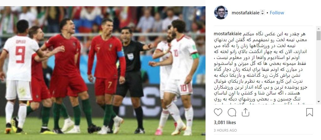 مصطفی کیایی کارگردان سینما، در واکنش به اظهاراتی که درباره پوشش بازیکنان و منع حضور بانوان در ورزشگاه شده بود در اینستاگرام نوشت: «هر چقدر به اين عكس نگاه ميكنم معني نيمه لخت رو نميفهمم كه گفتن اين بدنهاي نيمه لخت در ورزشگاهها زنان را به گناه مي اندازند، الان كه يه چهار انگشت بالاي زانو لخته كه اونم تو استاديوم واقعا از دور معلوم نيست ، فقط ميمونه بعضي ها كه گل ميزنن و لباسشونو در ميارن كه اونم فیفا براي اينكه زنان دچار گناه نشن براش كارت زرد گذاشته و بازيكنا ديگه به ندرت اين كارو ميكنه.