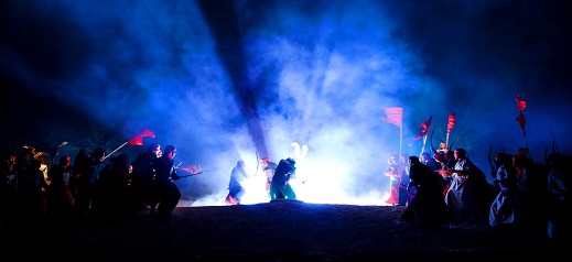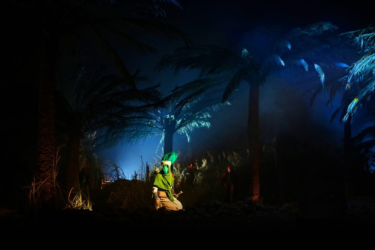 وارد مجموعه که شدیم نمایش در حال آغاز شدن بود و مخاطبان در یک سوله مسقف و بدون دیوار با سه صحنه نمایش مواجه بودند که به ترتیب باز و بسته می‌شوند. در اولین پرده کاروان اسرای کربلا، پرده‌ای دیگر از مصائب اهل بیت (ع) و پرده آخر هم رشادت‌های مدافعین حرم را با صحنه‌های جذاب انفجار به تصویر کشیده است.