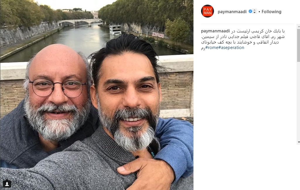 پیمان معادی تصویری از خود و بابک کریمی را در اینستاگرام منتشر کرد و در توضیح آن نوشت: «با بابک خان کریمى ارتیست در شهر رم. اقاى قاضى فیلم جدایى نادر از سیمین. دیدار اتفاقى و خوشایند با بچه کف خیابوناى رم.»