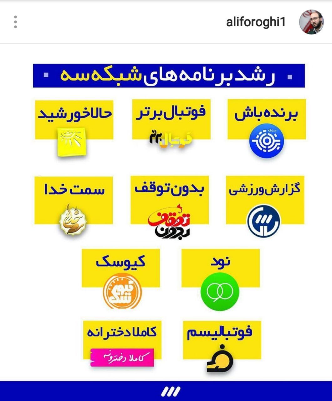 علی فروغی مدیر شبکه۳، در صفحه اینستاگرامخود، از رشد مخاطبان برنامههای شبکه سوم سیما ابراز رضایت کرد.