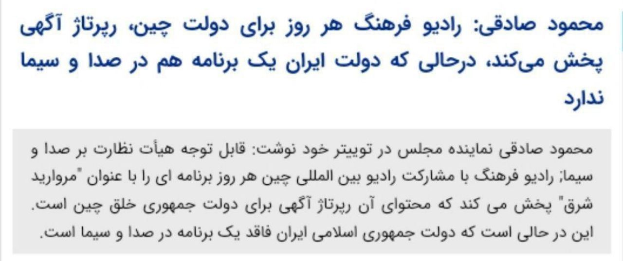 محمود صادقی در توییتر خود نوشت: رادیو فرهنگ هر روز برای دولت چین، رپرتاژ آگهی پخش می کند، درحالی که دولت ایران یک برنامه هم در صداوسیما ندارد.