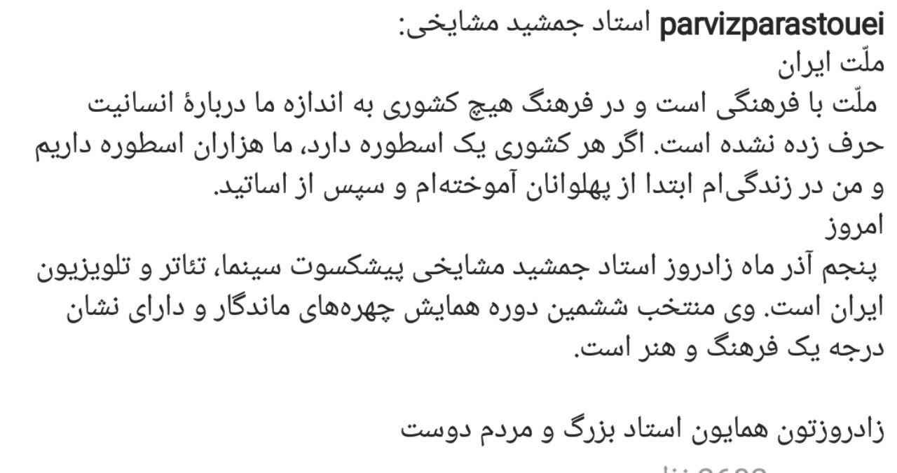پرویز پرستویی در حساب اینستاگرامش ۵ آذر زادروز تولد جمشید مشایخی را تبریک گفت و نوشت: اگر هر کشوری یک اسطوره دارد، ما هزاران اسطوره داریم.