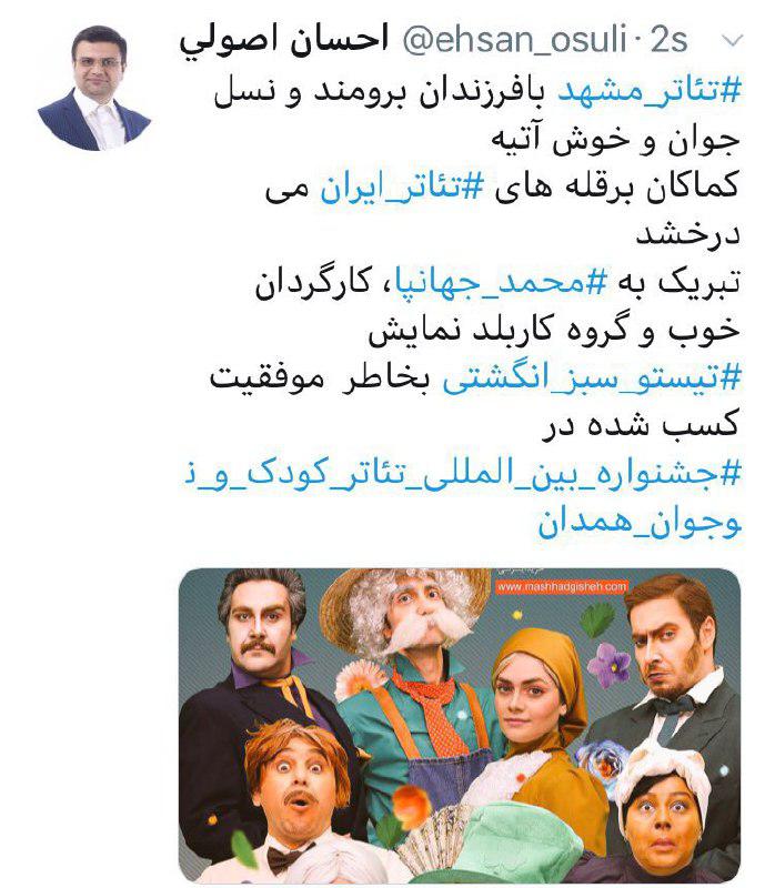 عکس/ توئیت احسان اصولی برای موفقیت تئاتر مشهد در جشنواره تاتر کودک و نوجوان