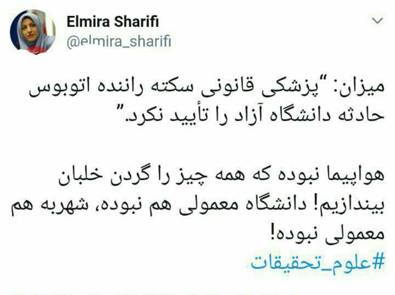المیرا شریفیمقدم در رابطه با حادثه ناگوار اتوبوس دانشجویان دانشگاه علوم تحقیقات توئیتی کنایه آمیز زد.