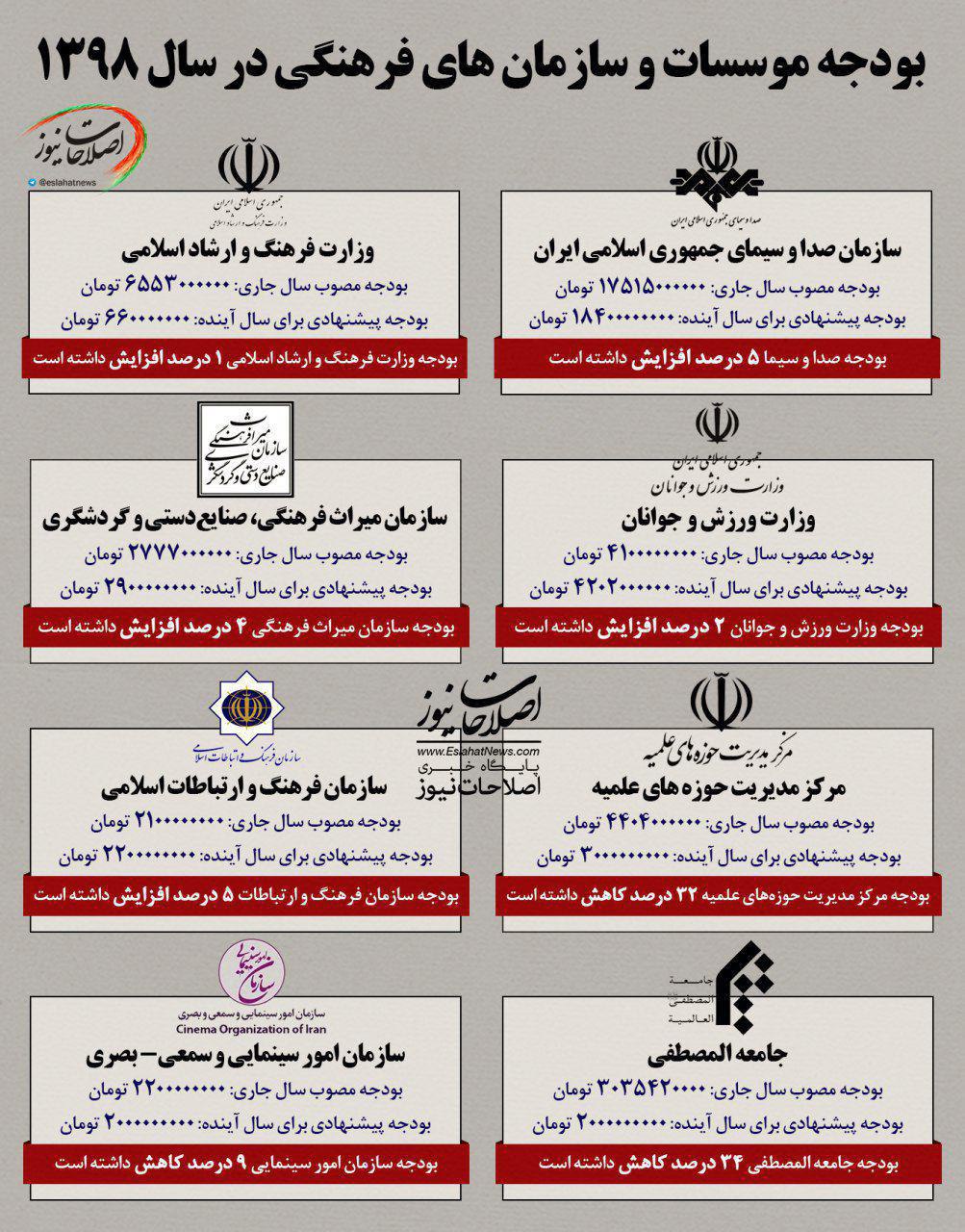 عکس/بودجه موسسات و سازمان های فرهنگی در سال ۱۳۹۸ در یک نگاه