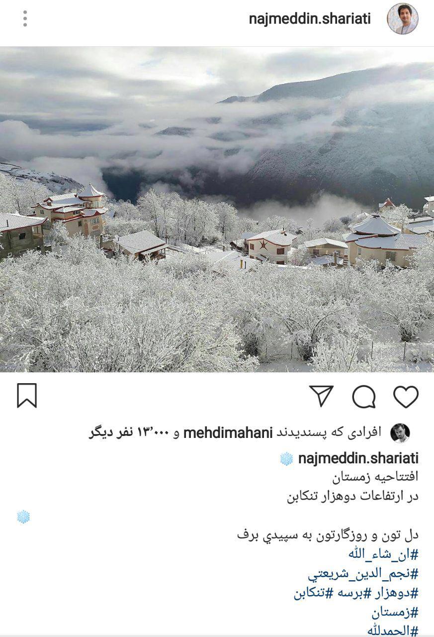 نجم الدین شریعتی مجری برنامه سمت خدا در اینستاگرام با انتشار تصویری از بارش برف در تنکابن نوشت: افتتاحیه زمستان در ارتفاعات دوهزار تنکابن.