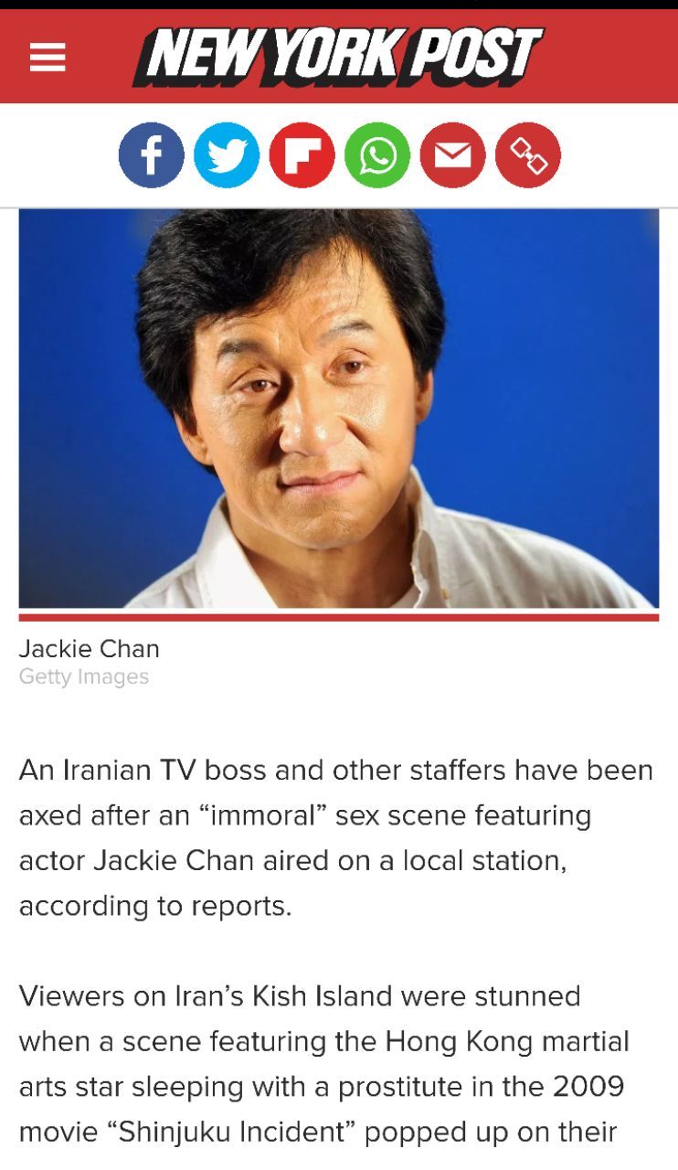 بر اساس گزارش‌ها، رئیس یک ایستگاه تلویزیونی ایران، به خاطر پخش صحنه غیراخلاقی جکی چان، به همراه دیگر کارکنان اخراج گردید.
