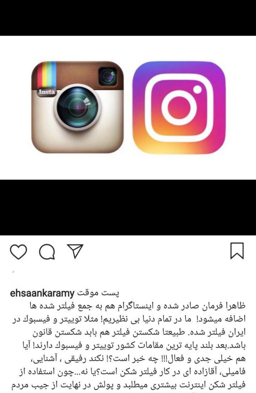 احسان کرمی با انتشار این عکس نوشت: ظاهرا فرمان صادر شده و اینستاگرام هم به جمع فیلتر شده ها اضافه میشود! ما در تمام دنیا بى نظیریم! مثلا توییتر و فیسبوک در ایران فیلتر شده. طبیعتا شکستن فیلتر هم بابد شکستن قانون باشد.بعد بلند پایه ترین مقامات کشور توییتر و فیسبوک دارند! آیا هم خیلى جدى و فعال!!! چه خبر است؟! نکند رفیقى ، آشنایى، فامیلى، آقازاده اى در کار فیلتر شکن است؟