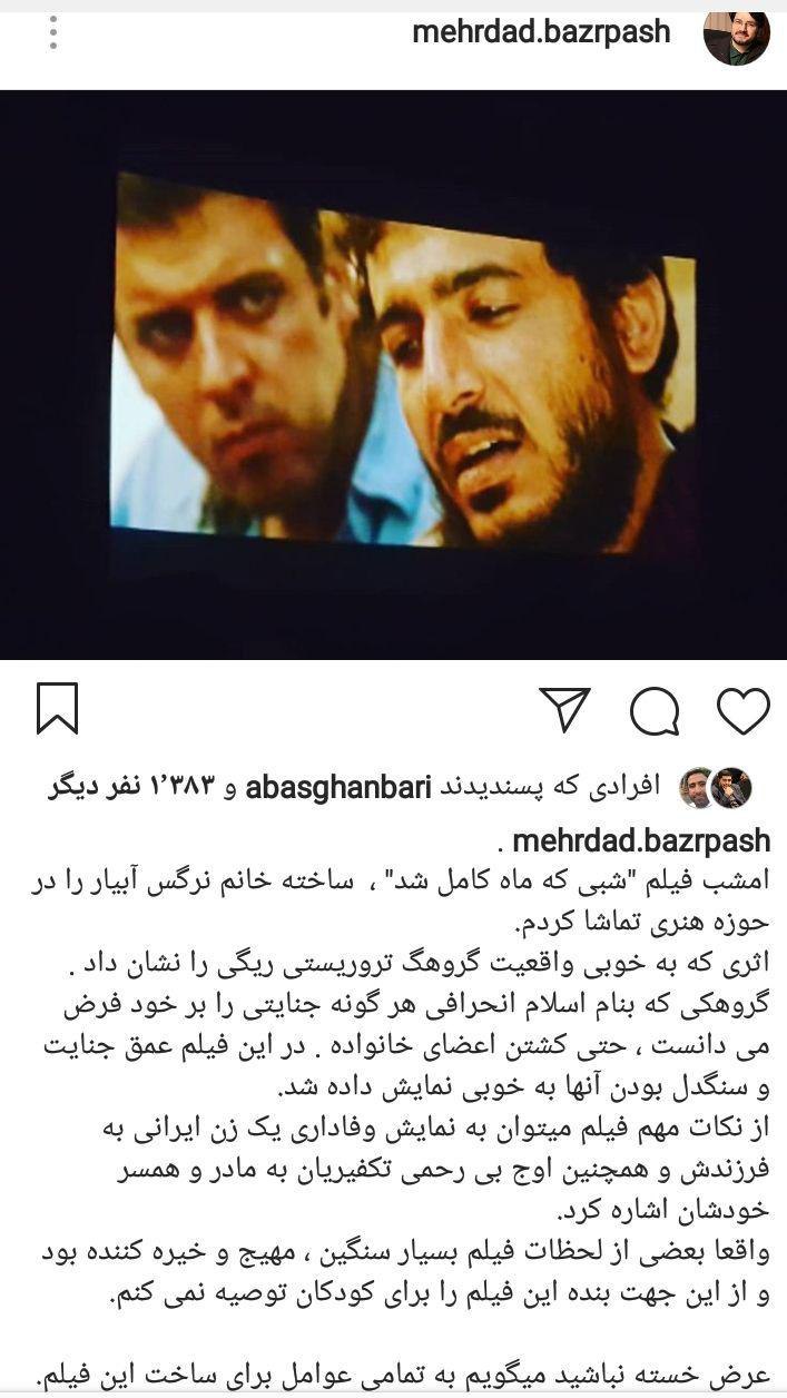 واکنش بذرپاش به فیلم «شبی که ماه کامل شد» در حساب شخصی اینستاگرامش را می بینید.