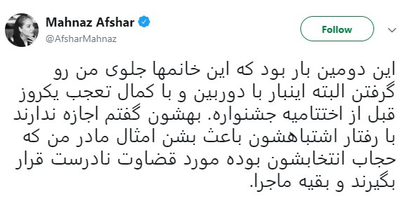 مهناز افشار در واکنش به ویدئویی از او که با عنوان امر به معروف یک سلبریتی در فضای مجازی منتشر شده است، در توییتی نوشت: «این دومین بار بود که این خانمها جلوی من رو گرفتن البته این بار با دوربین و با کمال تعجب یکروز قبل از اختتامیه جشنواره. بهشون گفتم اجازه ندارند با رفتار اشتباهشون باعث بشن امثال مادر من که حجاب انتخابشون بوده مورد قضاوت نادرست قرار بگیرند و بقیه ماجرا.»
