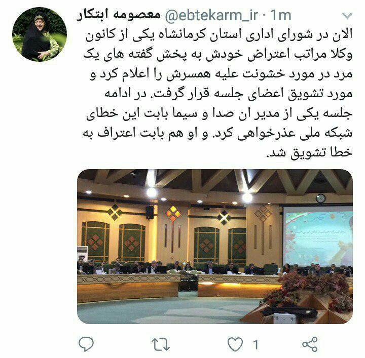 معصومه ابتکار از عذرخواهی یکی از مدیران صدا و سیما برای پخش روایت مردی که ۲۷ بار همسرش را کتک زد و اقدام زه طلاق گرفت، خبر داد.