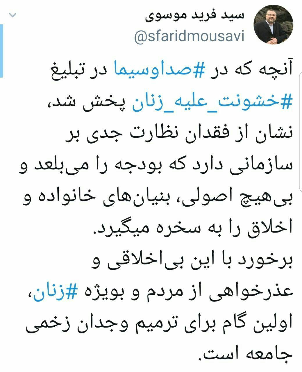 نماینده مردم تهران در واکنش به مهمان برنامه فرمول یک که از شوهرش 27 بار کتک خورده بود نوشت: آنچه که در صداوسيما در تبلیغ خشونت علیه زنان پخش شد، نشان از فقدان نظارت جدی بر سازمانی دارد.