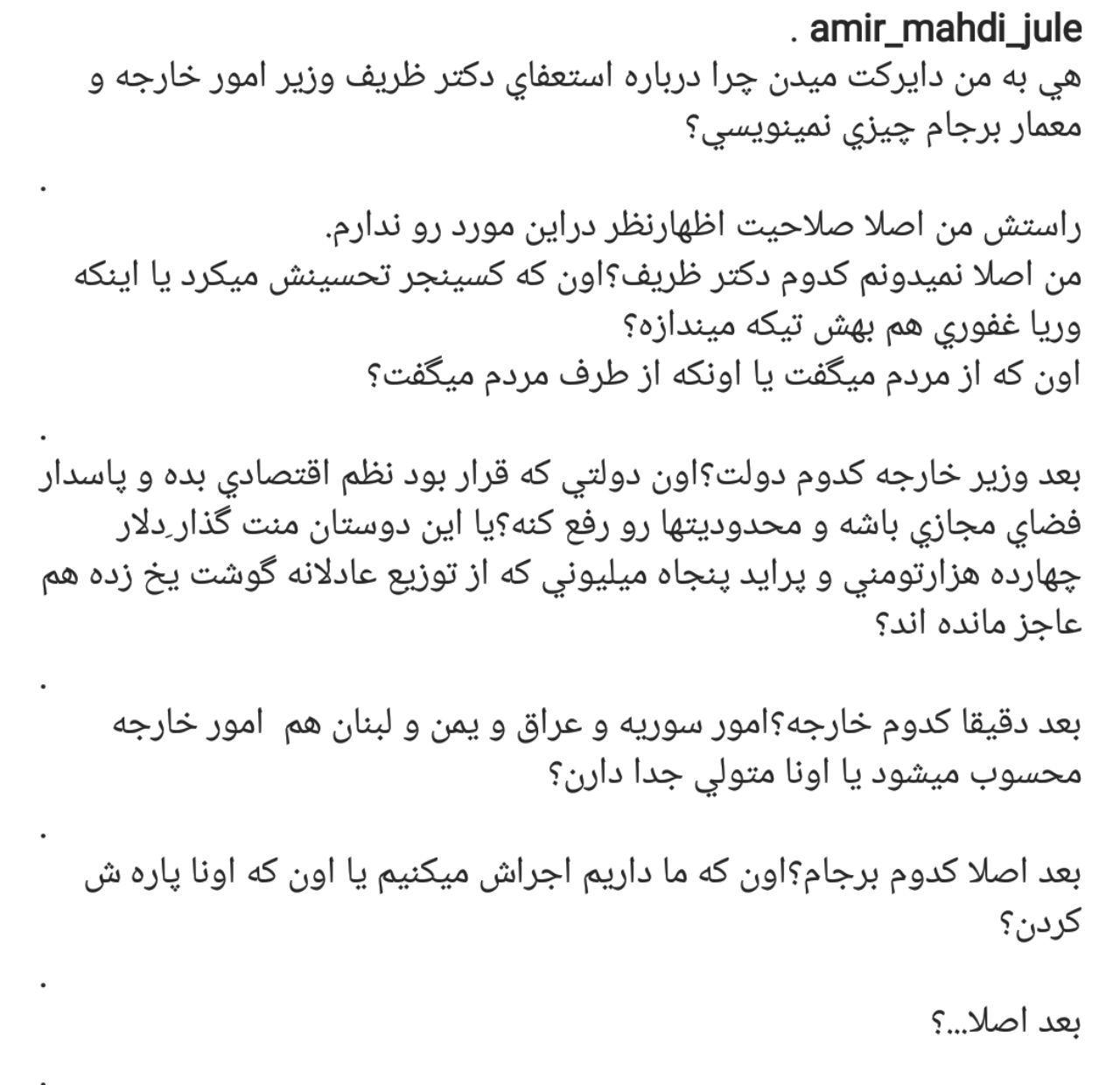 امیرمهدی ژوله طنزپرداز کشورمان اینستاپستی طنز در واکنش به استعفای کوتاه مدت «محمدجواد ظریف» وزیر امور خارجه منتشر کرد.