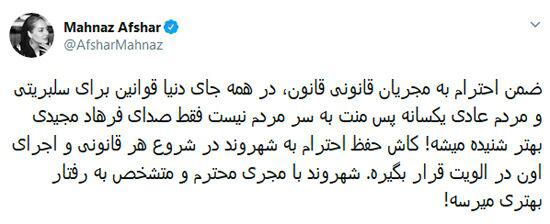 مهناز افشار در واکنش به اتفاقات اخیر فرهاد مجیدی و مامور راهنمایی رانندگی توئیت زد.
