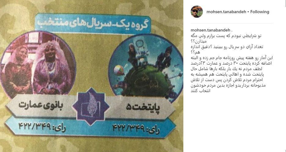 محسن تنابنده با انتشار تصویری از نتایج آرای دو سریال «پایتخت» و «بانوی عمارت» در جشنواره تلویزیونی جامجم، انتقاد خود را بیان کرد.