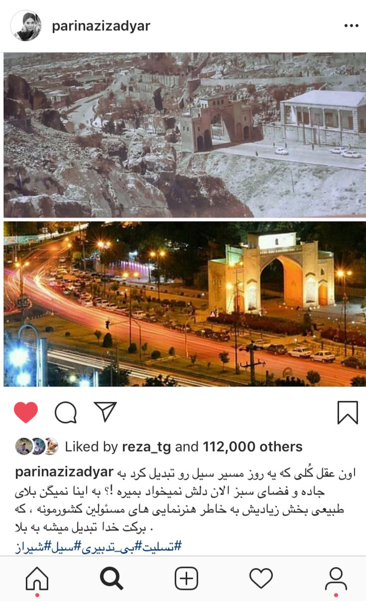 پست اينستاگرامي پريناز ايزديار درباره سيل و اون عقل كلي كه مسيل رو تبديل به خيابان كرد.