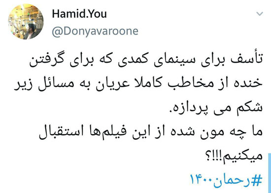 همان عده از ابتذال فزاینده ی سه کمدی روی پرده حسابی عصبانی شدهاند؛ چهار انگشت ساخته سعید سهیلی، زندانیها ساختهی ده نمکی و رحمان 1400 ساختهی منوچهر هادی سه فیلمی هستند که نه خندهدار از کار در آمدهاند و نه اصلا ارزش تماشا دارند.