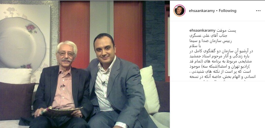 احسان کرمی با انتشار تصویری از خود و جمشید مشایخی در یک برنامه تلویزیونی در اینستاگرام، خطاب به عبدالعلی علیعسگری رییس سازمان صداوسیما نوشت: