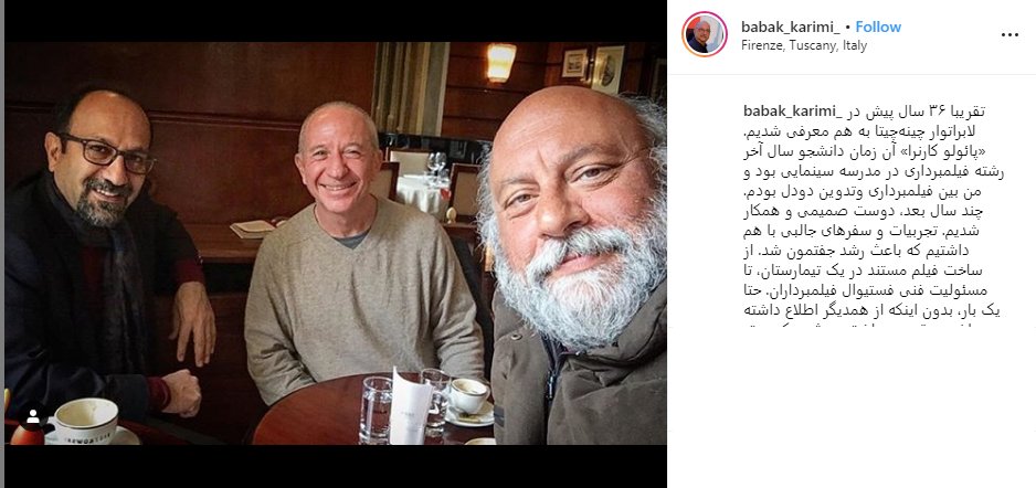 بابک کریمی بازیگر سینمای ایران تصویری از خود در کنار اصغر فرهادی و پائولو کارنرا را در اینستاگرام به اشتراک گذاشت و در توضیح آن نوشت: «تقریبا ۳۶ سال پیش در لابراتوار چینه‌چیتا به هم معرفی شدیم. «پائولو کارنرا» آن زمان دانشجو سال آخر رشته فیلمبرداری در مدرسه سینمایی بود و من بین فیلمبرداری و تدوین دودل بودم. چند سال بعد، دوست صمیمی و همکار شدیم. تجربیات و سفرهای جالبی با هم داشتیم که باعث رشد جفتمون شد. از ساخت فیلم مستند در یک تیمارستان، تا مسئولیت فنی فستیوال فیلمبرداران. حتی یک بار، بدون اینکه از همدیگر اطلاع داشته باشیم، رقیب و عاشق بی ثمر یک دختر شده بودیم. یا به روایت دیگری، یک دختر جفتمون رو گذاشته بود سر کار. یکی از اولین دوستانی بود که در نمایش‌های خانگی‌ام با سینما نوین ایران آشنا کردم (باشو، دونده، دستفروش و...).