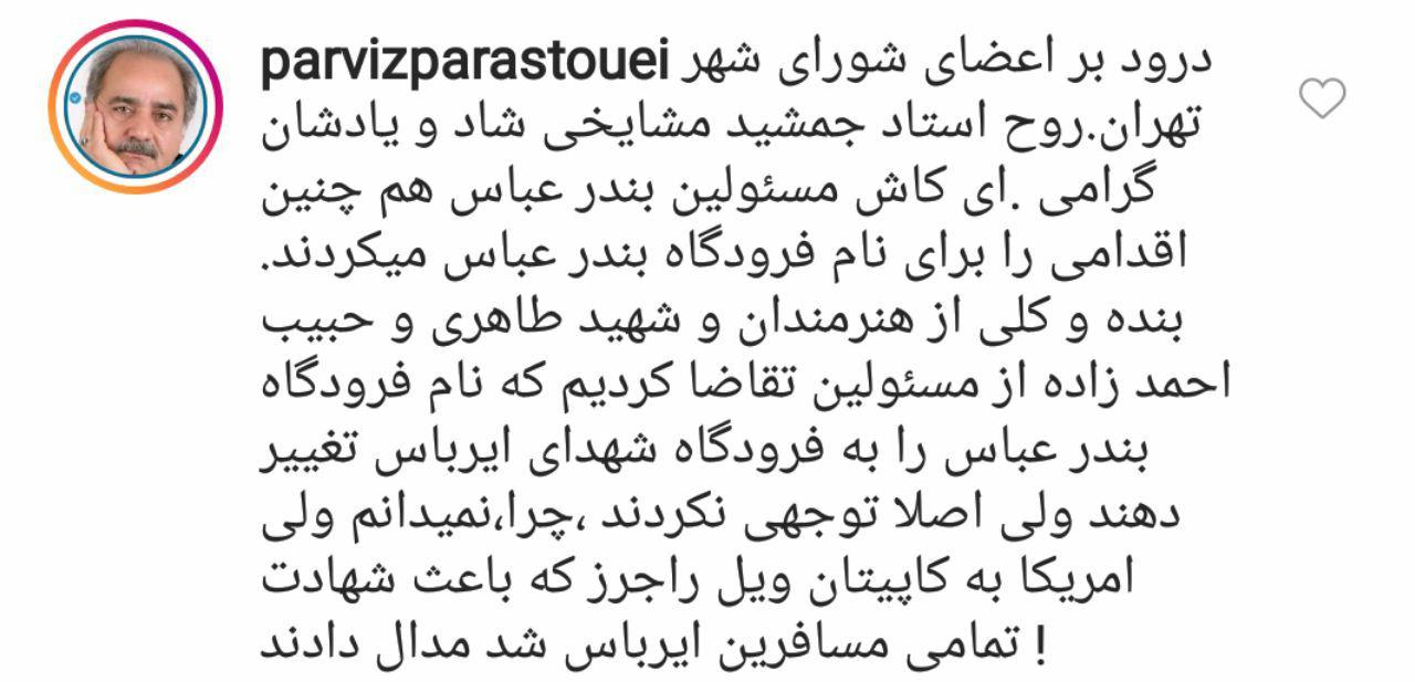 واکنش پرویز پرستویی به نامگذاری خیابانی به نام جمشید مشایخی