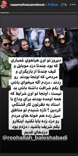 نعیمه نظام‌دوست در اینستاگرامش درباره سرقت کیف و موبایل بازیگران در مراسم تشییع پیکر جمشید مشایخی نوشت.