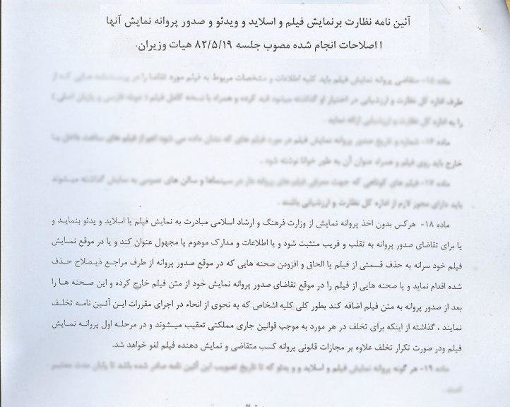 اما چه تحریم و چه سانسور فیلم‌ها، هر دو، کاری غیرقانونی هستند که هیچ نهاد یا فردی اجازه انجام آن را ندارد. ماده ۱۸ آیین‌نامه نظارت بر نمایش فیلم که مصوب هیئت وزیران است، تصریح می‌کند: « هر کس ... خودسرانه به حذف قسمتی از فیلم ... اقدام نماید یا ... به‌طور کلی، کلیه اشخاص که به نحوی از انحاء در اجرای مقررات این آیین‌نامه تخلف نمایند، ... به موجب قوانین جاری مملکتی تعقیب می‌شوند ...»