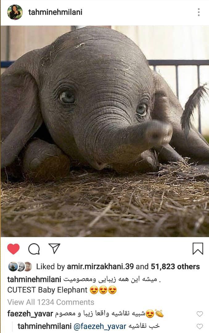 تهمینه میلانی با انتشار عکسی از کاراکتر «دامبو» در فیلمی سینمایی با این عنوان در صفحه اینستاگرامش و تعریفی که از این کاراکتر کرده این تصور را به وجود آورده که او «دامبو» را با یک فیلم واقعی اشتباه گرفته است.