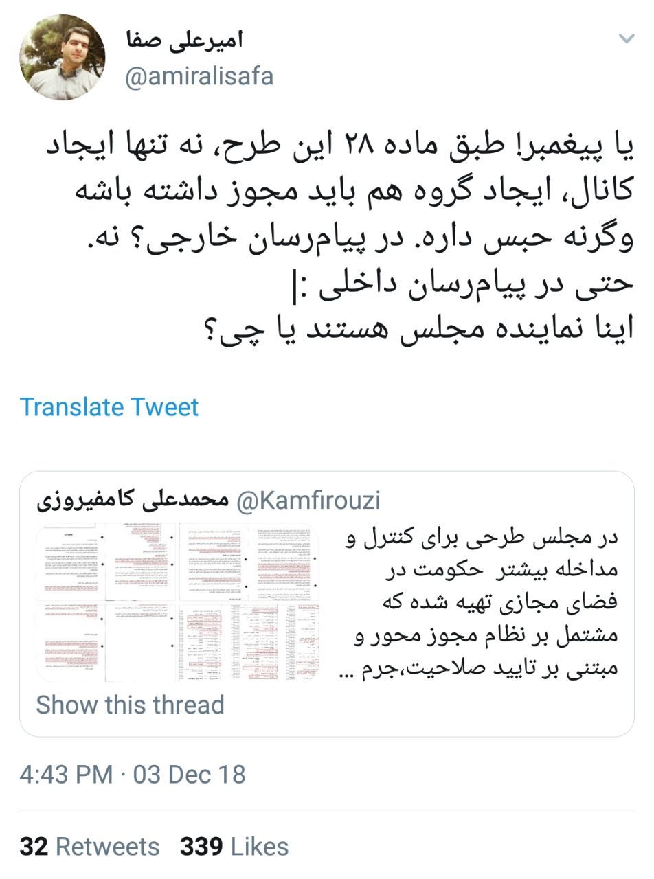 عکس/واکنش یک کاربر توییتر به طرح مجلس درباره پیام رسان ها