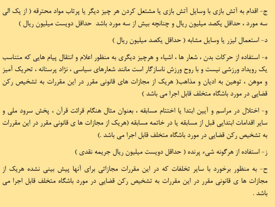 اگر تماشاگری از لیزر استفاده کند دست کم باشگاه ده میلیون تومان جریمه خواهد شد و از آنجایی که قرار است استادیومها مجهز به دوربین تشخیص چهره تماشاگر شوند این جریمه باید از تماشاگر گرفته شود.