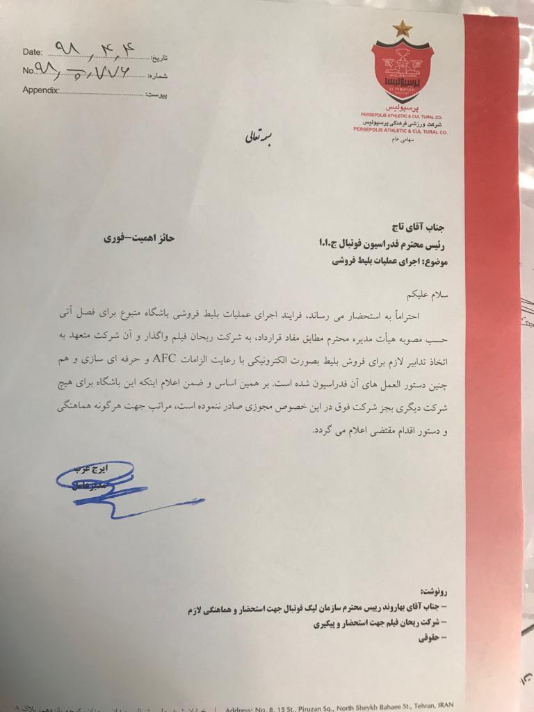 طبق اطلاعیهای، بر اساس قرارداد منعقده شرکت ریحان فیلم با باشگاه پرسپولیس بصورت انحصاری مجاز به فروش بلیط مسابقات می باشد.