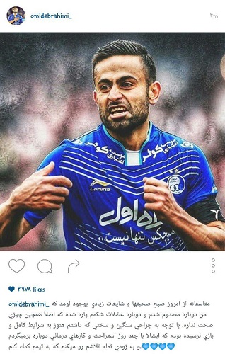 به گزارش خبر فوری ؛ امید ابراهیمی با انتشار پستی، خبر مصدومیتش از ناحیه شکم را تکذیب کرد. او در اینستاگرام خود نوشت:«متاسفانه از امروز صبح صحبتها و شايعات زيادي بوجود اومد كه من دوباره مصدوم شدم و دوباره عضلات شكمم پاره شده كه اصلأ همچين چيزي صحت نداره، با توجه به جراحي سنگين و سختي كه داشتم هنوز به شرايط كامل و بازي نرسيده بودم كه ايشالا با چند روز استراحت و كارهاي درماني دوباره برميگردم و به زودي تمام تلاشم رو ميكنم كه به تيمم كمك كنم.»