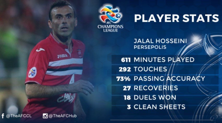 آمار سیدجلال حسینی در رقابت‌های فصل جاری لیگ قهرمانان آسیا: 611 دقیقه بازی/ 292 ضربه به توپ/ 73 درصد دقت پاس/ 27 پوشش توپ/ 18 پیروزی در دوئل‌های تن به تن/ حضور در 3 کلین‌شیت تیمش