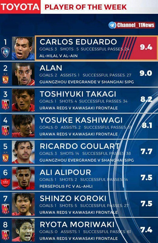 به گزارش خبر فوری ؛ سایت رسمی کنفدراسیون فوتبال آسیا (AFC) از طریق حساب کاربری رسمی رقابتهای لیگ قهرمانان آسیا در شبکه اجتماعی «توئیتر»، بازیکنان برتر دور برگشت از مرحله یک چهارم نهایی لیگ قهرمانان آسیا را معرفی کرد که براین اساس کارلوس ادواردو، هافبک برزیلی تیم فوتبال الهلال عربستان که در پیروزی 3 بر صفر این تیم برابر العین امارات هتتریک کرد و 24 پاس سالم به همتیمیهاش داد با کسب 9.4 امتیاز بهترین بازیکن این هفته لیگ قهرمانان آسیا لقب گرفت.