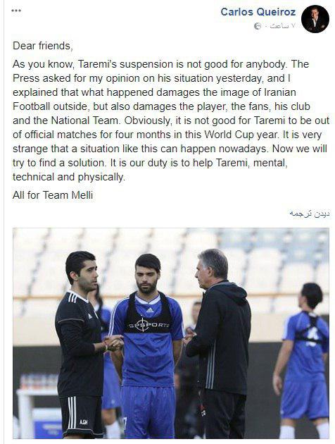 واکنش فیسبوکی کارلوس کی‌روش به محرومیت طارمی+عکس