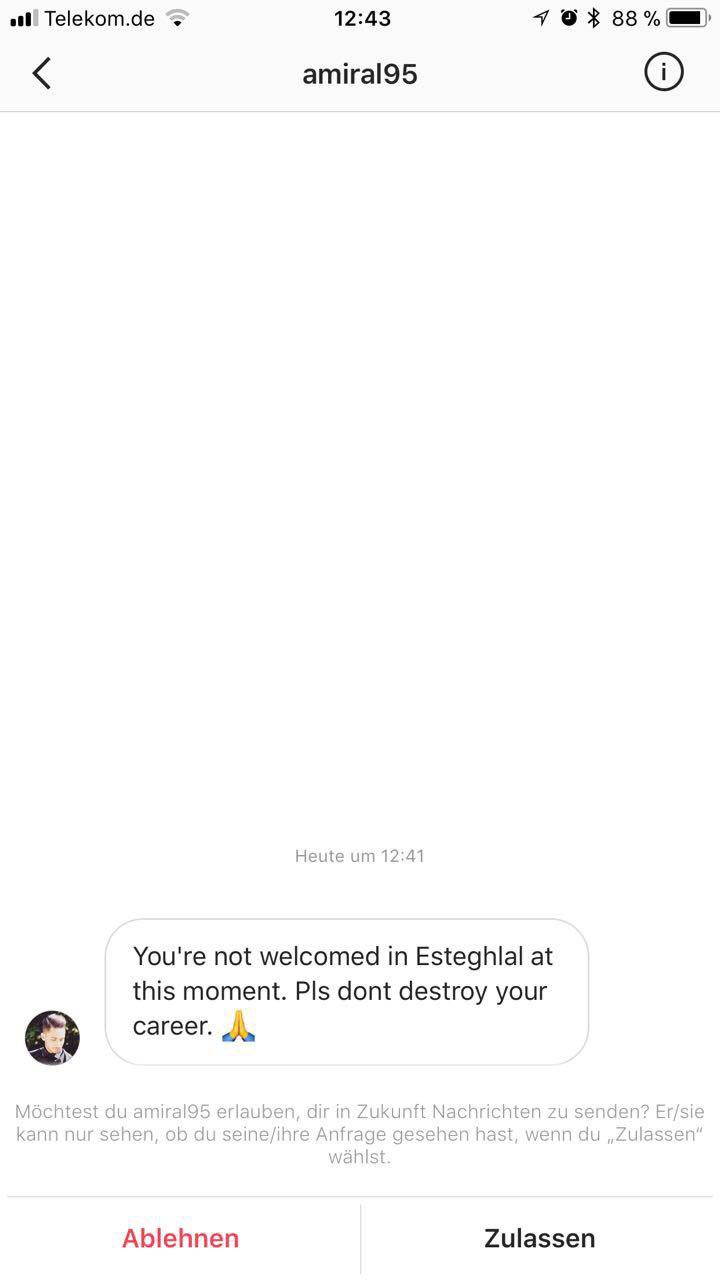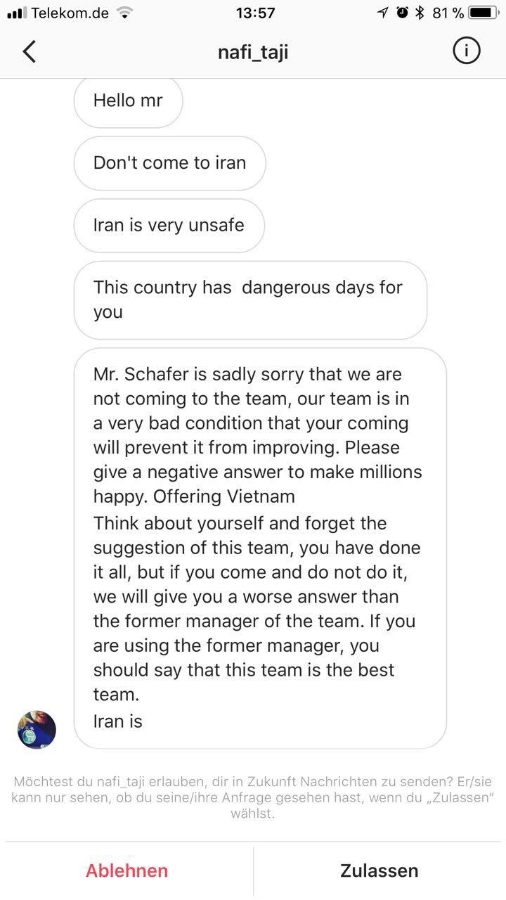 این پیام‌های درخواست در ادامه به تحقیر و حتی تهدید جانی هم تغییر شکل داده‌اند. در یکی از این پیام‌ها او پدربزرگ خطاب شده و یک کاربر دیگر از او خواسته به استقلال نیاید. فرد دیگری تهدید کرده که اگر شفر وارد ایران شود او را در فرودگاه به قتل خواهد رساند! کاربر دیگری از او خواسته تا با آمدن به ایران و قبول هدایت استقلال، کارنامه خوب گذشته‌اش را نابود نکند. شفر هم این تهدیدها را کاملا جدی گرفته و تصاویر این پیام‌ها را برای مدیران باشگاه استقلال ارسال کرده و منتظر واکنش و پاسخ آنها به این تهدیدهاست. با توجه به واکنش شفر به این پیام‌های تهدید، استقلالی‌ها کار سختی دارند تا بتوانند نگرانی او را رفع کنند. شفر تهدیدها را جدی گرفته ولی این موضوع مانه از ان نشده که با استقلال نهایی کند.