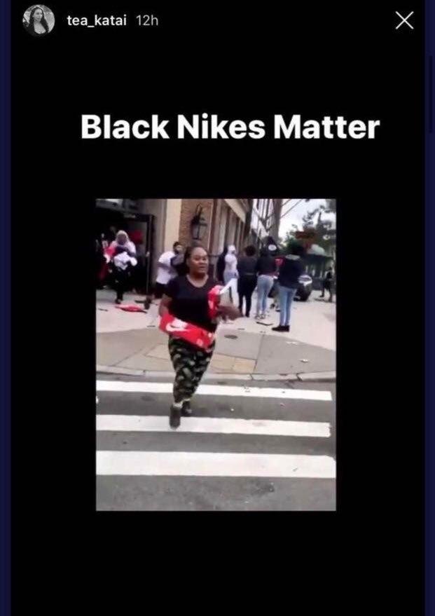 همچنین او در پست دیگری تصویری به تمسخر معترضان پرداخته بود و با انتشار تصویر زنی که فروشگاه نایک را غارت کرده و چیزی دزدیده بود، از هشتگ " Black Nikes Matter " به جای " Black Lives Matter " که در این روزها به نماد معترضان تبدیل شده، استفاده کرده بود.