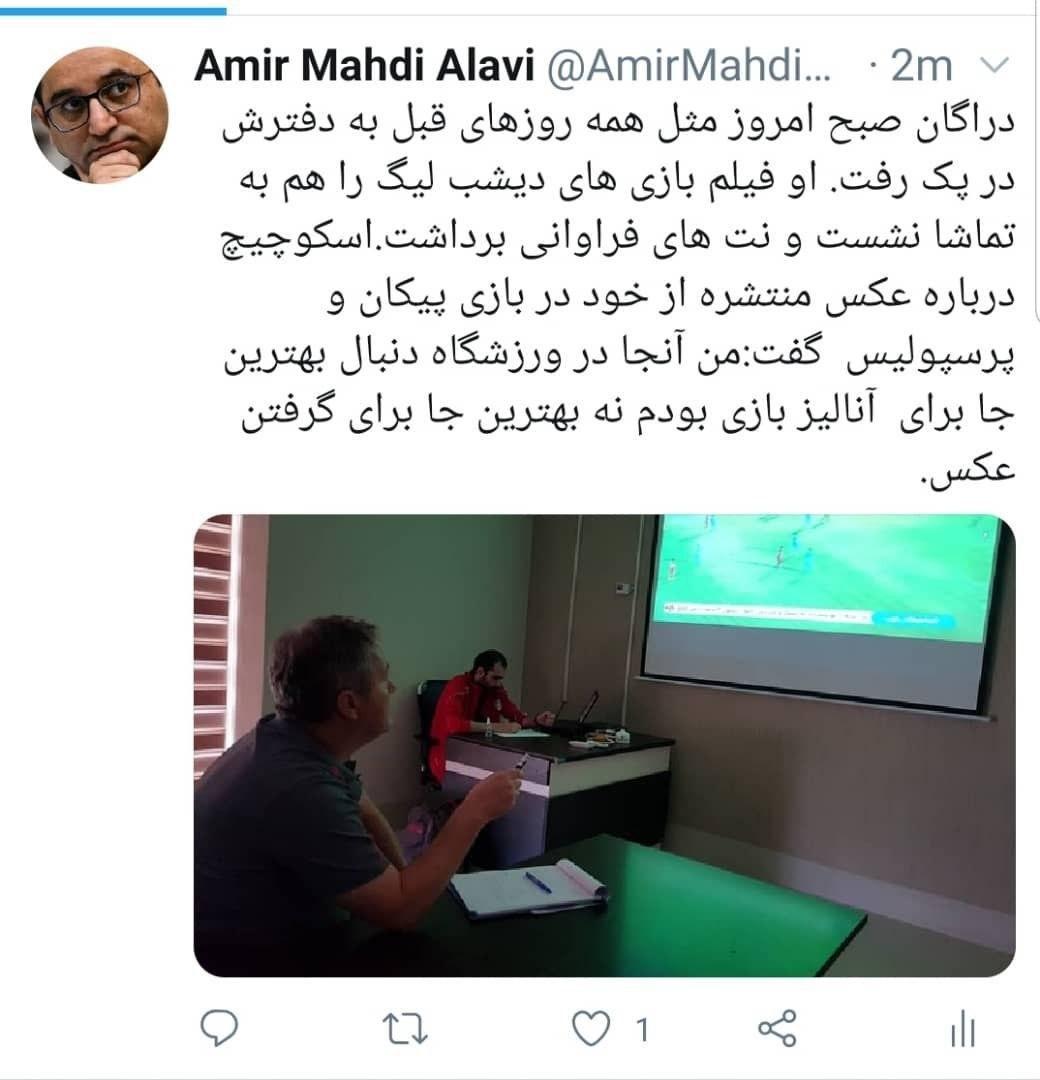 امیر مهدی علوی، سخنگوی فدراسیون فوتبال با انتشار یک توئیت درباره این موضوع گفت: دراگان صبح امروز مثل همه روز‌های قبل به دفترش در پک رفت. او فیلم بازی‌های دیشب لیگ را هم به تماشا نشست و نت‌های فراوانی برداشت. اسکوچیچ درباره عکس منتشره از خود در بازی پیکان و پرسپولیس گفت: من آنجا در ورزشگاه دنبال بهترین جا برای آنالیز بازی بودم نه بهترین جا برای گرفتن عکس.