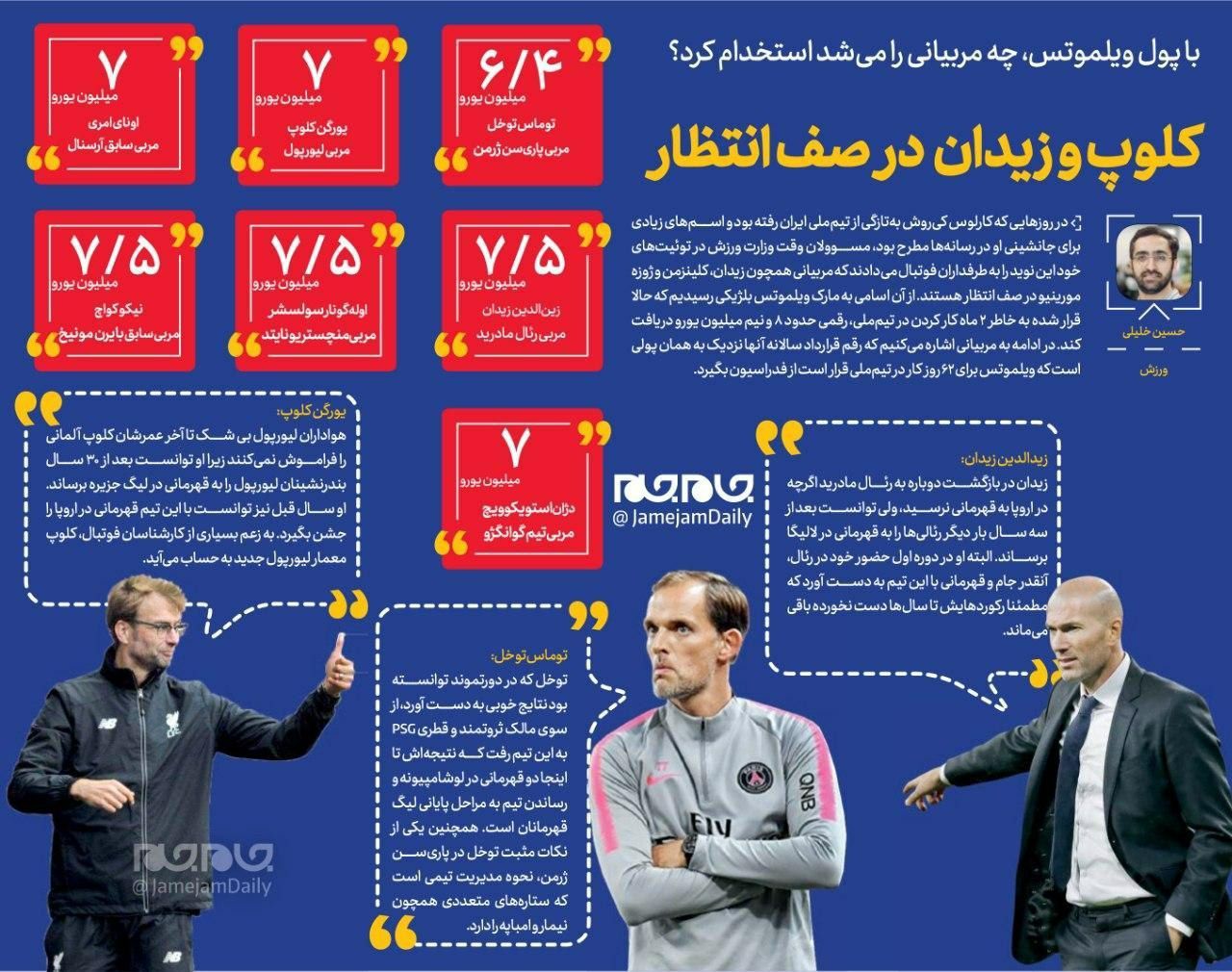 در روزهایی که کارلوس کی روش به تازگی از تیم ملی ایران رفته بود و اسم های زیادی برای جانشینی او در رسانه ها مطرح بود، مسوولان وقت وزارت ورزش در توئیت های خود این نوید را به طرفداران فوتبال می دادند که مربیانی همچون زیدان، کلینزمن و ژوزه مورینیو در صف انتظار هستند. از آن اسامی به مارک ویلموتس بلژیکی رسیدیم که حالا قرار شده به خاطر ۲ ماه کار کردن در تیم ملی، رقمی حدود ۸ و نیم میلیون یورو دریافت کند. در ادامه به مربیانی اشاره می کنیم که رقم قرارداد سالانه آنها نزدیک به همان پولی است که ویلموتس برای ۶۲ روز کار در تیم ملی قرار است از فدراسیون بگیرد.