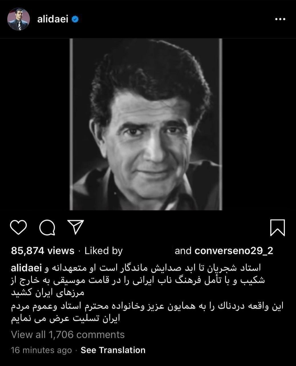 اسطوره فوتبال ایران با انتشار پستی درگذشت استاد آواز ایران را تسلیت گفت.