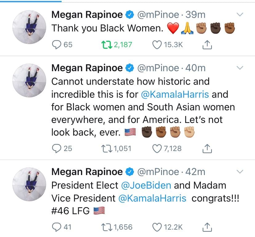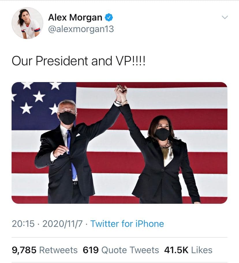 همچنین الکس مورگان، دیگر ستاره ایالت متحده نیز از انتخاب جو بایدن و البته کامالا هریس ابراز خوشحالی کرده است.